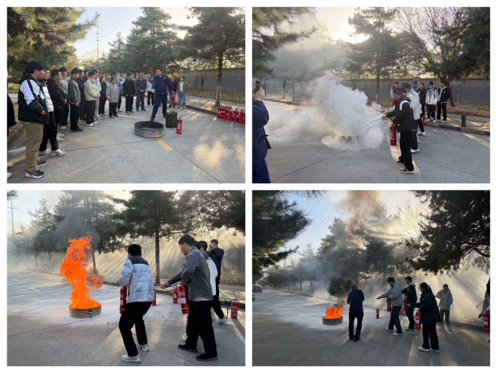 在实操演练环节,许磊老师对现场陈列的干粉灭火器等消防器材进行逐一介绍,详细演示了干粉灭火器“提、拔、握、压”的操作步骤与注意事项。随后,参训师生在保卫处工作人员的全程指导下,有序分组进行灭火器实操练习,在实战场景中熟练掌握初期火灾处置技能,切实将理论知识转化为应急能力。