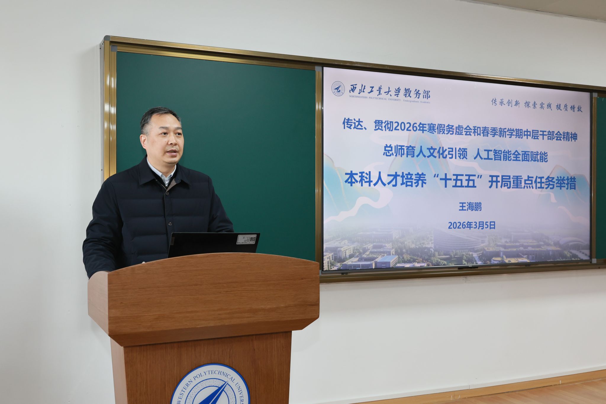 教务部部长王海鹏传达了寒假务虚会、春季新学期中层干部会精神,并以《总师育人文化引领 人工智能全面赋能 本科人才培养“十五五”开局重点任务举措》为题作主旨报告。他表示,2026年,学校将深入推进“千人千校优秀生源萃取计划”,以生源质量的持续领跑夯实人才根基;深入挖掘“1→0”重大工程基础问题研究,以“高峰领航计划”引导学生早进实验室、早进课题组;深入构建“人工智能+”高质量课程体系,以一流资源推动人工智能赋能人才培养模式全面升级。